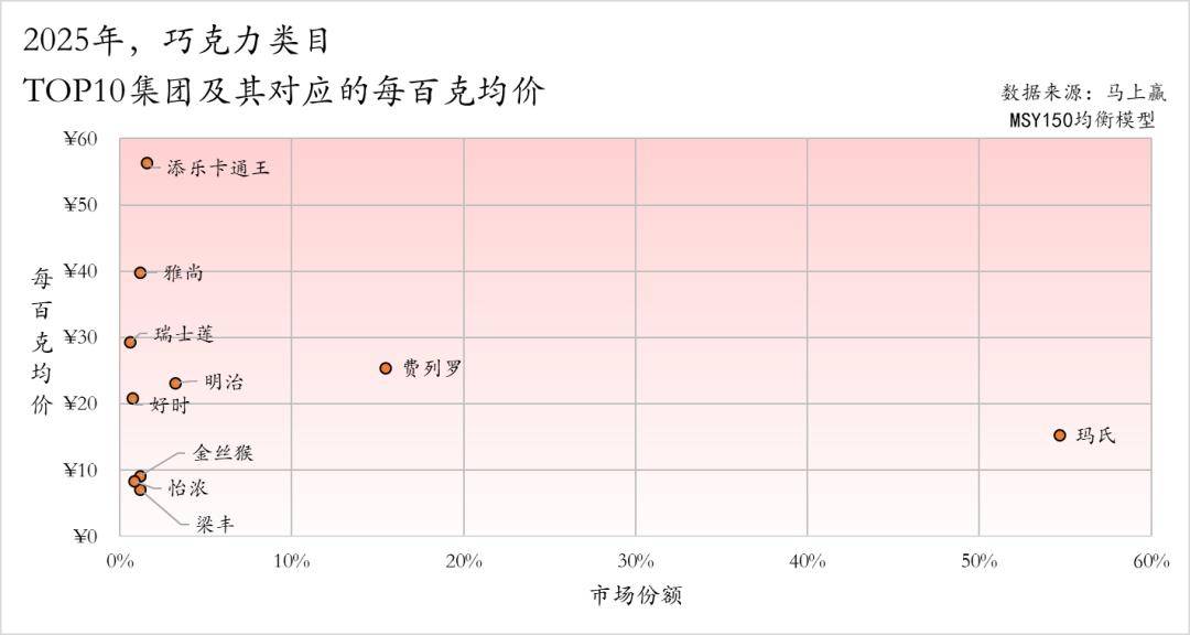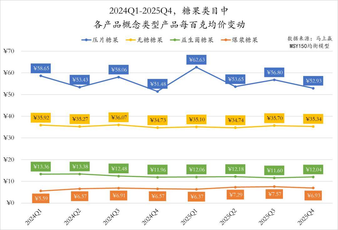 糖果正在时间段内各季度中的占比均高于巧克力一倍,但正在2025年下半年其表示不如巧克力类目强劲。糖果则只要4%摆布,因而也有着较高的每百克均价,进行细致的察看取阐发。此中美佳园每百克均价高达50元,Q1达3.5%摆布,