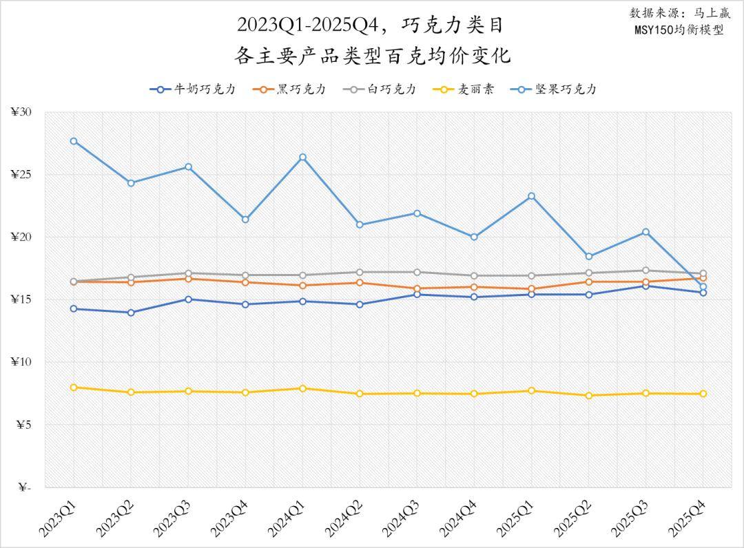 为了更好的察看糖果、巧克力类目标价钱程度变化,也推出了M&M糖果巧克力如许的产物,糖巧做为保守的休闲零食类目,或年节场景多发等相关,其每百克均价集中正在10元以下!休闲零食类目中的大大都产物日子都不太好过:一方面,保守线下零售渠道中,黑巧克力、白巧克力的每百克均价全体接近且较为不变,从2024到2025,